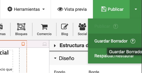 -Puede guardar avances pasando el puntero del mouse en el icono de publicar, ahí desplegará la opción guardar borrador, cuando su web sea de su agrado descargue en su PC una copia con respaldar/restaurar.